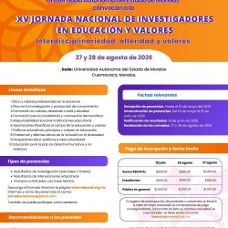 XV Jornada Nacional de Investigadores en Educación y Valores Publicada en abril 13, 2026abril 14, 2026 por Lourdes Nanzihuan Rodríguez Ramos Fecha de realización: 27 y 28 de agosto de 2026